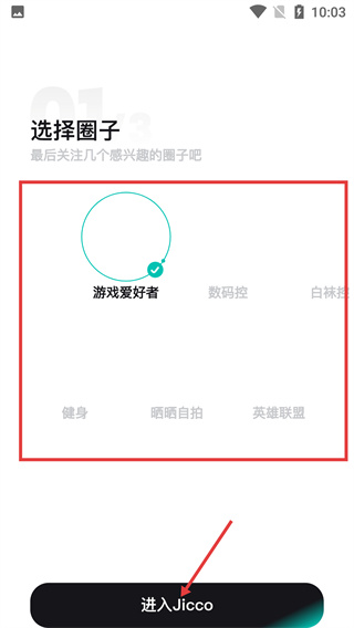 4、进入选择圈子页面,选中感兴趣的圈子,点击【进入Jicco】按钮完成初始设置。
