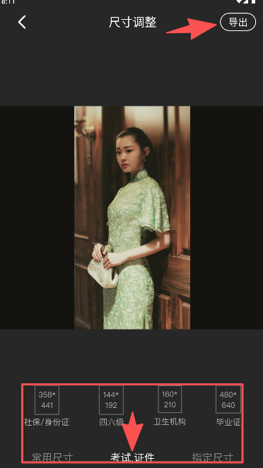 3、在尺寸面板选择所需预设尺寸,确认后点击“导出”完成处理。