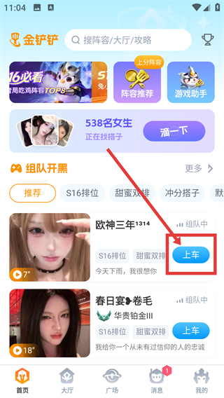 1、在首页组队开黑板块找到目标搭子,点击其对应的【上车】按钮,就能进入该搭子的组队房间啦。