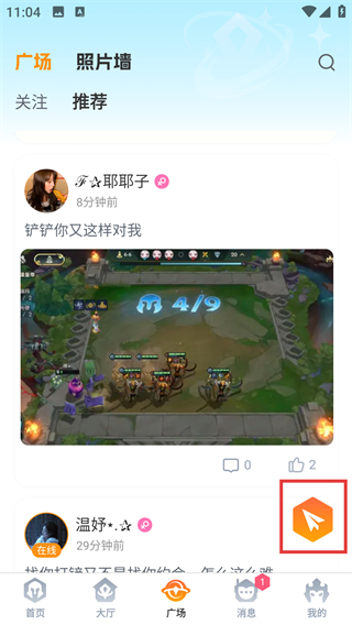 3、在广场页面点击右下角的发布按钮,就能进入内容发布界面,准备分享自己的游戏动态啦。