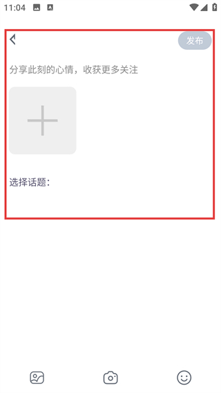 4、在发布界面输入心情内容,添加图片并选择话题后,点击【发布】就能分享自己的动态啦。