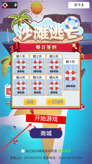 1、在游戏的每日签到界面,点击【开始游戏】按钮,进入“关卡1”的游戏游玩界面。