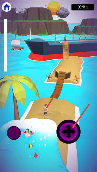 2、在关卡游玩界面,通过右下角的方向控制按钮,操控角色沿梯子、路径移动,向船只所在区域前进。