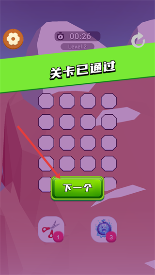 4、关卡通关后,在“关卡已通过”界面中,点击【下一个】按钮,进入后续关卡继续游玩。