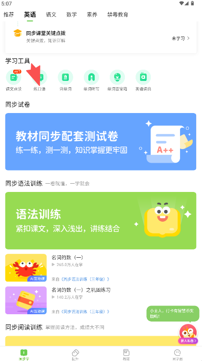 1、在软件“学习工具”板块找到并点击“练口语”图标。