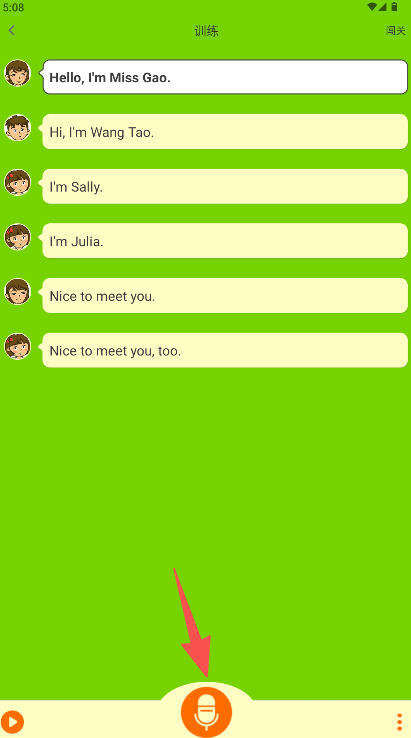 3、跟随屏幕显示的口语对话内容,在点击麦克风图标进行跟读,系统将评估发音。