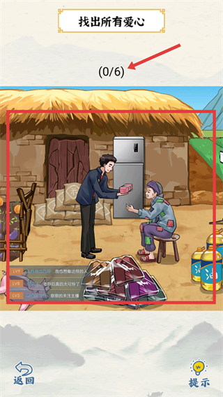 2、进入【找出所有爱心】关卡后,查看当前进度【(0/6)】,开始在场景中寻找爱心元素。