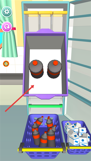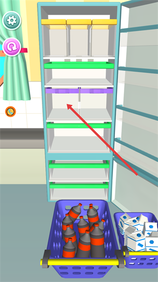 3、进入整理关卡后,将底部待整理的物品,对应放置到冰箱的空层架区域,开始进行物品的分类整理操作。