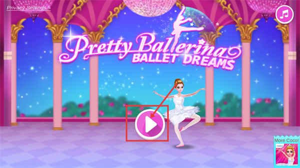 1、点击启动按钮进入【Pretty-Ballerina-BALLET-DREAMS】,开启芭蕾装扮的游戏流程。