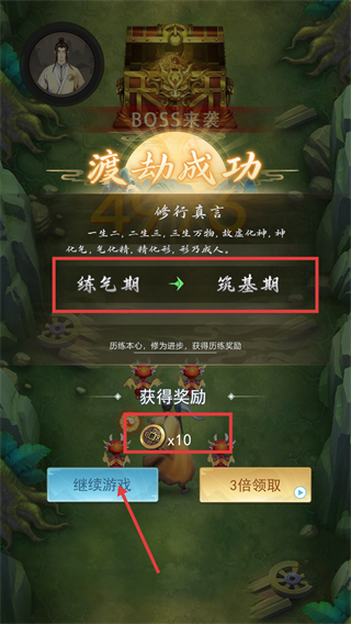 4、渡劫成功后从【练气期】进阶到【筑基期】,领取【x10】奖励后点击【继续游戏】推进关卡。