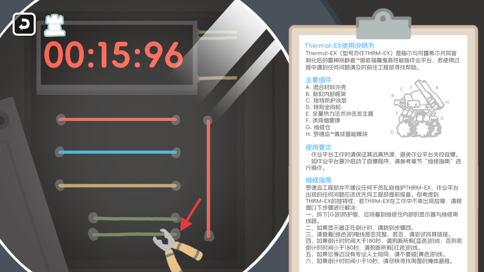3、根据右侧指引,用工具(如钳子)处理装置内的线路等部件,完成检修步骤。
