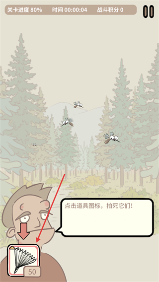 2、当蚊子出现后,点击左下角的道具图标,使用道具拍打蚊子,消灭它们以积累战斗积分。