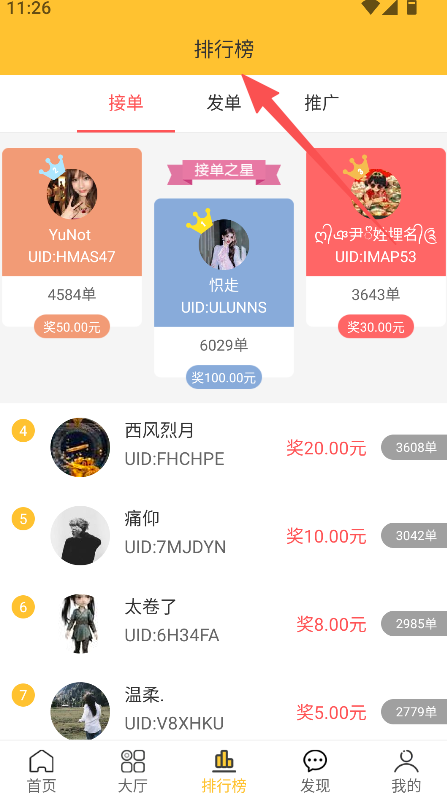 1、设有排行榜板块,分接单发单推广三类榜单,展示对应用户的接单量及对应的奖励金额。
