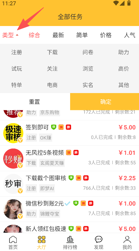 1、打开软件后,进入大厅板块,点击类型选择对应任务类别。
