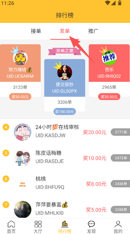 3、进入排行榜板块,可查看接单发单推广的榜单及对应用户信息。