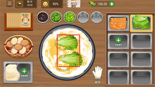 2、蛋液摊好后,从食材区选取【生菜】添加到摊面,合理摆放让配料分布更均匀美观。