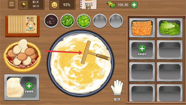 4、操作逻辑简单直观,摊面糊、加配料、卷煎饼等步骤清晰易懂,碎片化时间即可开启流畅经营。