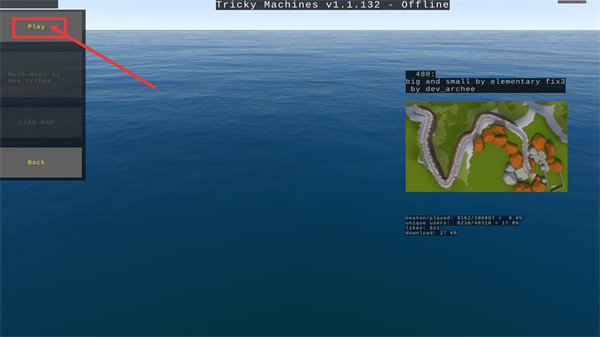 1、进入【Tricky-Machines-v1.1.132-Offline】界面,点击【Play】按钮开启游玩,该关卡由dev_archee开发,可查看地图的游玩数据。
