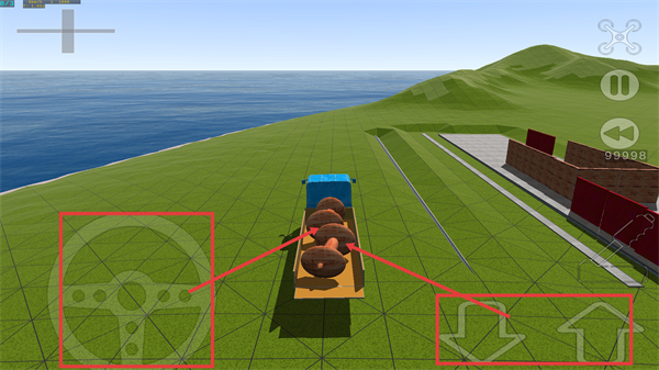 2、关卡内用【方向盘图标】操控载具,借助【上下按钮】调整货物位置,同时利用右上角【无人机图标】辅助观察场景布局。