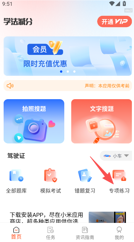 1、聚焦驾考及学法减分学习,设拍照搜题文字搜题功能,覆盖多类练习板块。