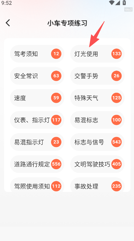 2、专项练习分驾考须知灯光使用等类别,每个类别标注对应题量,便于精准选择练习内容。
