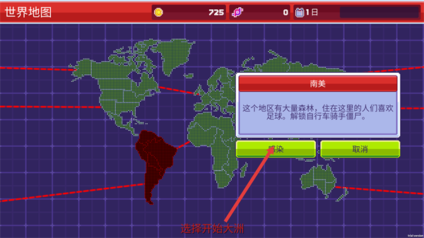 2、在南美大洲的详情弹窗中,点击【感染】按钮,进入该大洲的城市选择界面。