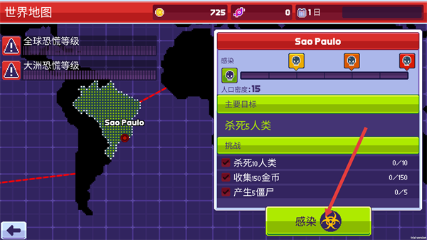 3、在城市(如Sao-Paulo)的详情界面,点击【感染】按钮,进入该城市的游戏关卡。