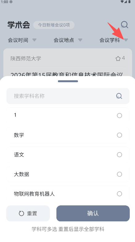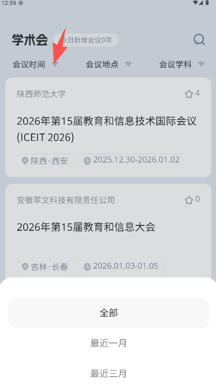 2、提供多维度筛选机制,可按会议时间、举办地区、所属学科等多种条件进行快速筛选。