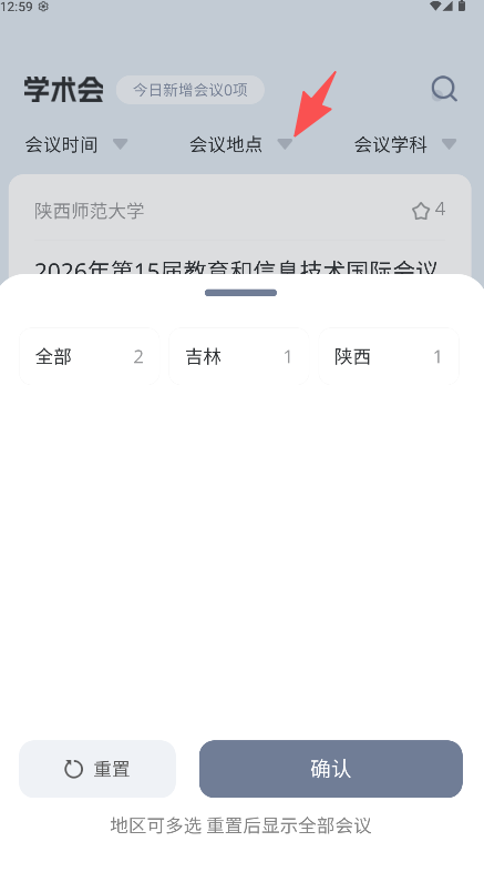 2、在首页点击“会议地点”筛选框展开进入地区选择。