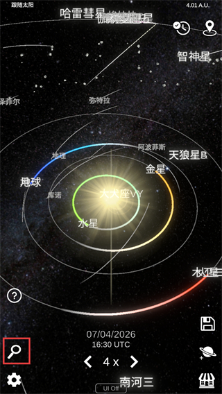 2、在模拟界面点击放大镜图标,可激活搜索功能,查看各天体的位置与运行轨道。