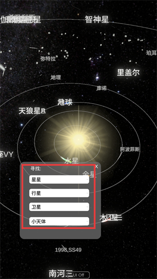 3、通过搜索功能选择【星星】【行星】等天体类型,精准定位目标天体,深入探索太阳系结构。