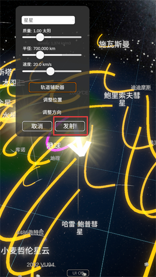4、设置天体参数后,确认后点【发射】模拟天体运行。