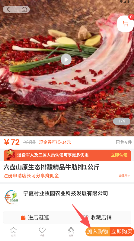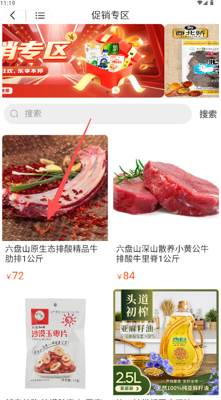 2、在页面浏览并选择目标商品(如“六盘山原生态排酸精品牛肋排”)。