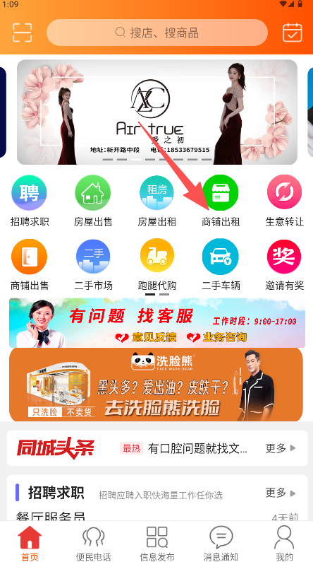 1、在首页点击“商铺出租”图标进入相应分类列表。