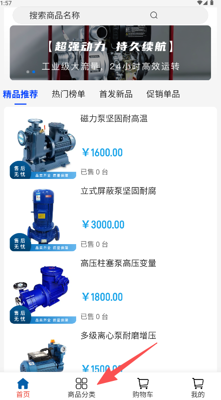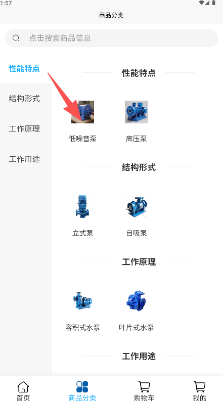 2、在分类页面左侧选择分类右侧将展示对应商品类别(如“低噪音泵”)。