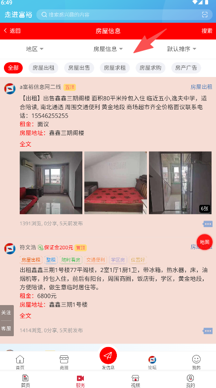 2、生活服务查询与对接功能,可通过分类查找家政、维修、租售等服务详情并直接联系提供方。