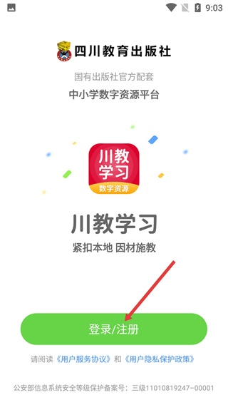 1、进入【川教学习】软件,点击页面的【登录/注册】按钮进入登录界面。