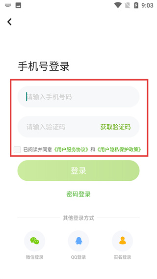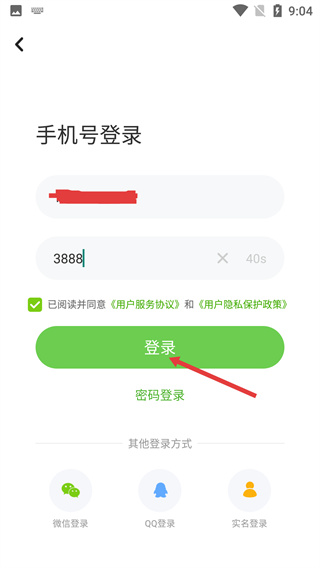 3、在【手机号登录】界面填好手机号与验证码,勾选协议后,点击绿色的【登录】按钮。