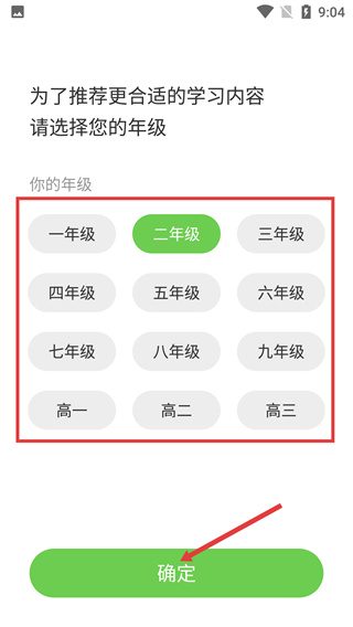 4、登录后进入年级选择界面,挑选对应的年级,点击【确定】按钮以获取适配的学习内容,完成账号的注册登录操作。