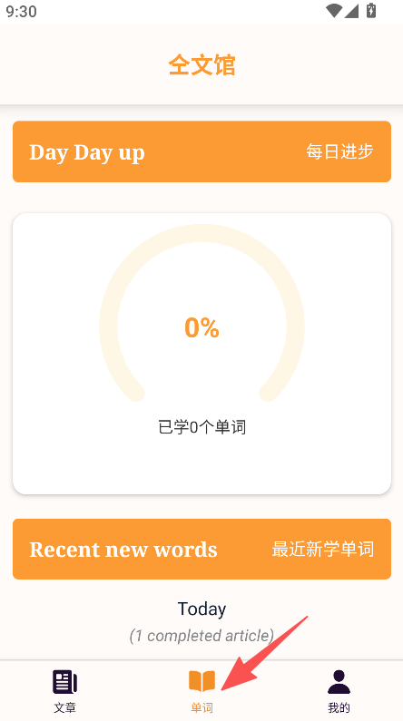 2、设Day Day up板块显示学习进度,呈现已学单词数量,便于追踪单词学习的完成情况。