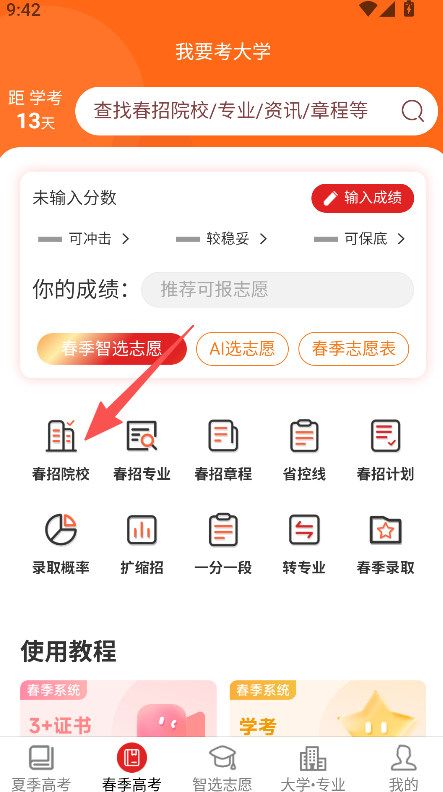 1、打开我要考大学,点击春招院校板块。