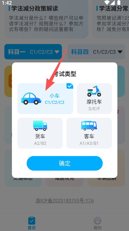 1、打开驾考宝书,选择对应考试类型并点击确定。