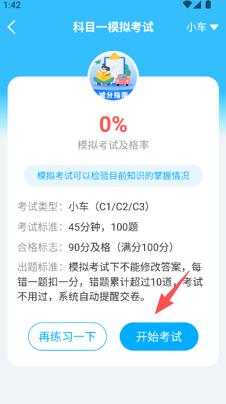 2、进入科目一模拟考试页面,点击开始考试。