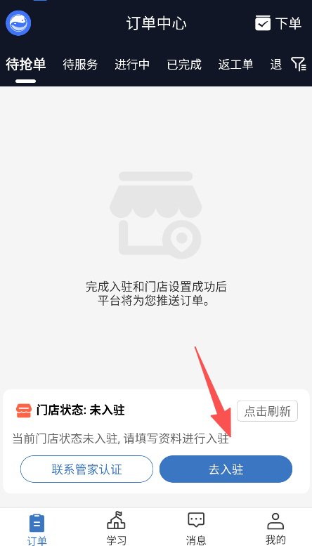 1、打开周周帮,进入订单中心点击去入驻。
