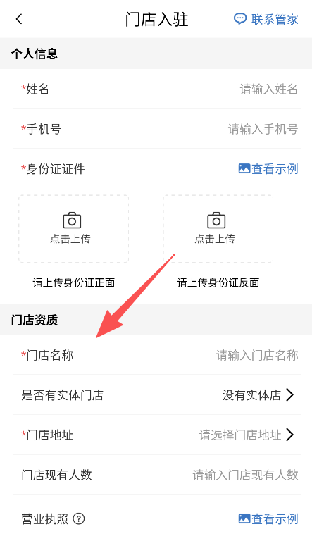 2、在门店入驻中填写个人信息及门店资质。