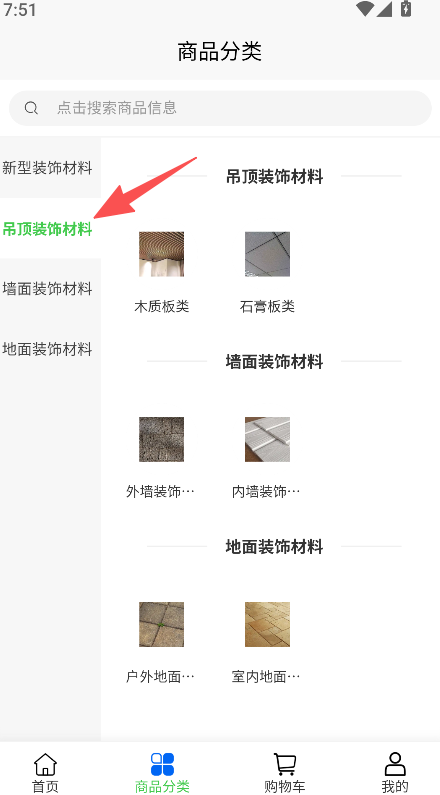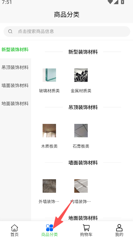 1、提供商品分类功能,含新型装饰材料等类别,各类别下细分不同材质类型的建材。