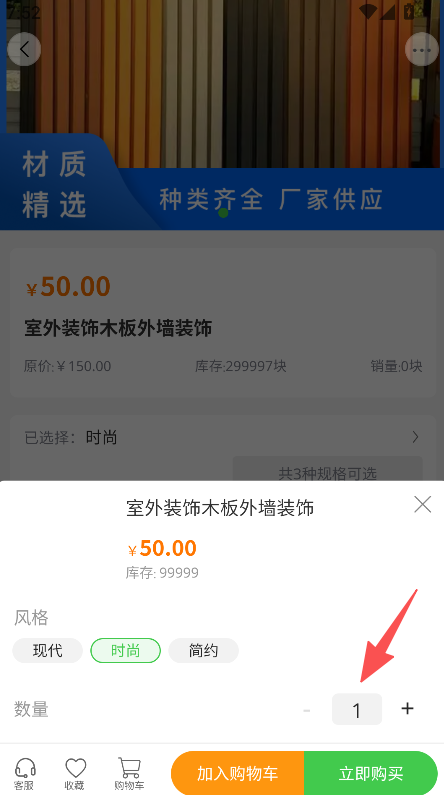2、商品支持风格数量选择,配备加入购物车立即购买功能,贴合建材采购的实际操作流程。