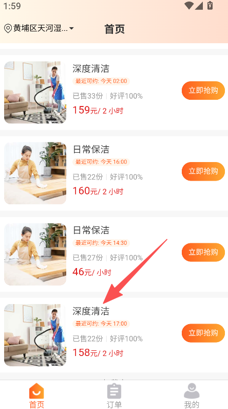 1、定位本地区域,展示家政服务含价格可约时间销量好评,适配本地家政服务的信息获取需求。