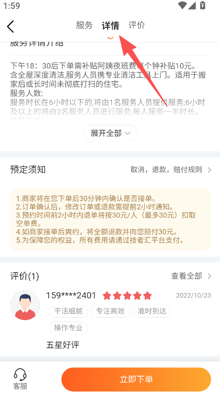 2、服务详情呈现服务内容预定须知评价,贴合用户了解服务细节的需求,提供全面的服务信息。