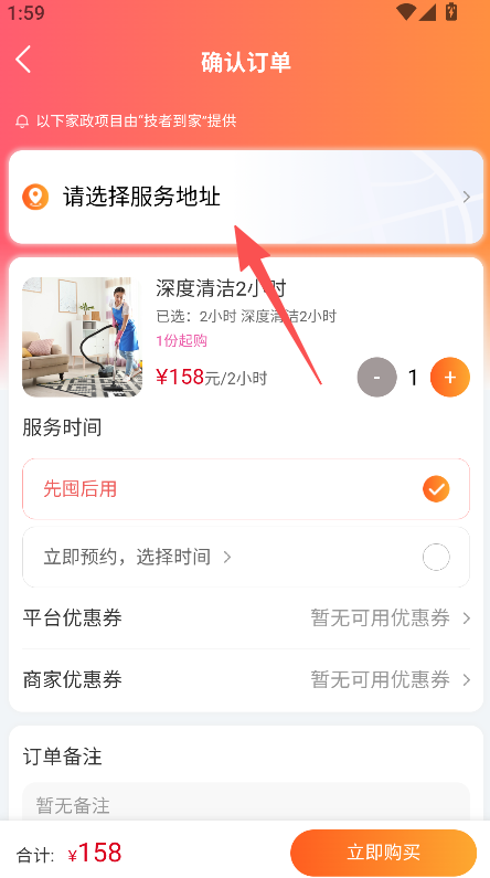 3、提供确认订单功能,选择服务地址时间数量,完成家政服务的下单操作。